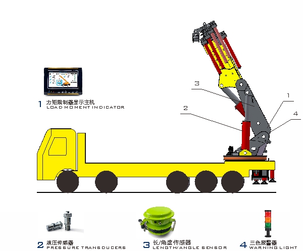 折臂吊力矩限制器主要由力矩限制器顯示器、長/角度傳感器、液壓傳感器等組成。通過各傳感器檢測信號,可以實時在顯示器上顯示起重機的額定起重量、實際起重量、角度、作業(yè)幅度等信息,并根據(jù)情況輸出報警信號和控制信號,輔助作業(yè)人員安全操作起重機。