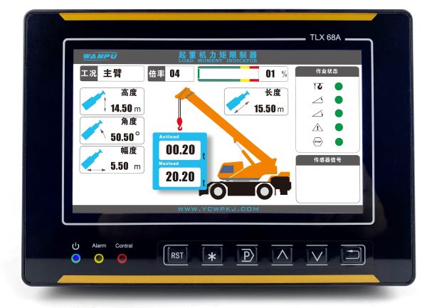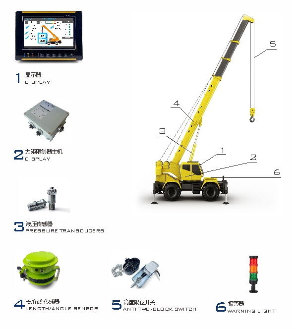 越野起重機(jī)力矩限制器主要由力矩限制器顯示主機(jī)、液壓傳感器、長(zhǎng)/角度傳感器組成。通過各傳感器檢測(cè)信號(hào),可以實(shí)時(shí)在顯示器上顯示起重機(jī)的額定起重量、實(shí)際起重量、臂長(zhǎng)、角度等信息,并根據(jù)情況輸出報(bào)警信號(hào)和控制信號(hào),輔助作業(yè)人員安全操作起重機(jī)。